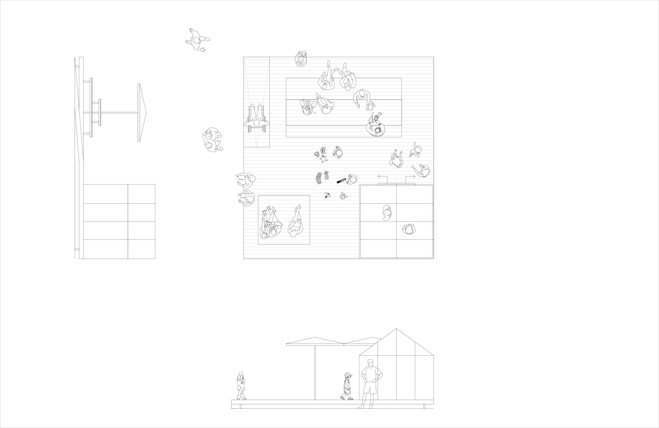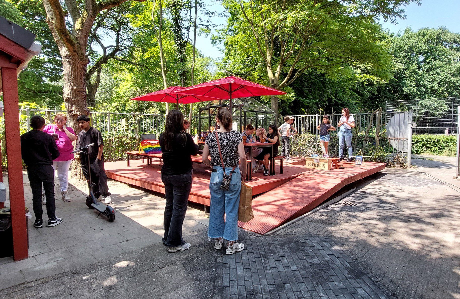 Het ontwerp van de buitenbieb bestaat uit een rood geschilderde vlonder met daarop een boekenkas(t)je (voor plantjes en plantenboeken), een loungenet (waar je lekker lui kunt lezen) en een picknicktafel (die naast een tafel ook een tribune is). De bestaande tuinhuisjes zijn opgeknapt, er is een loungehoek om lekker te hangen en een terrasje om lekker rustig in het zonnetje te lezen.