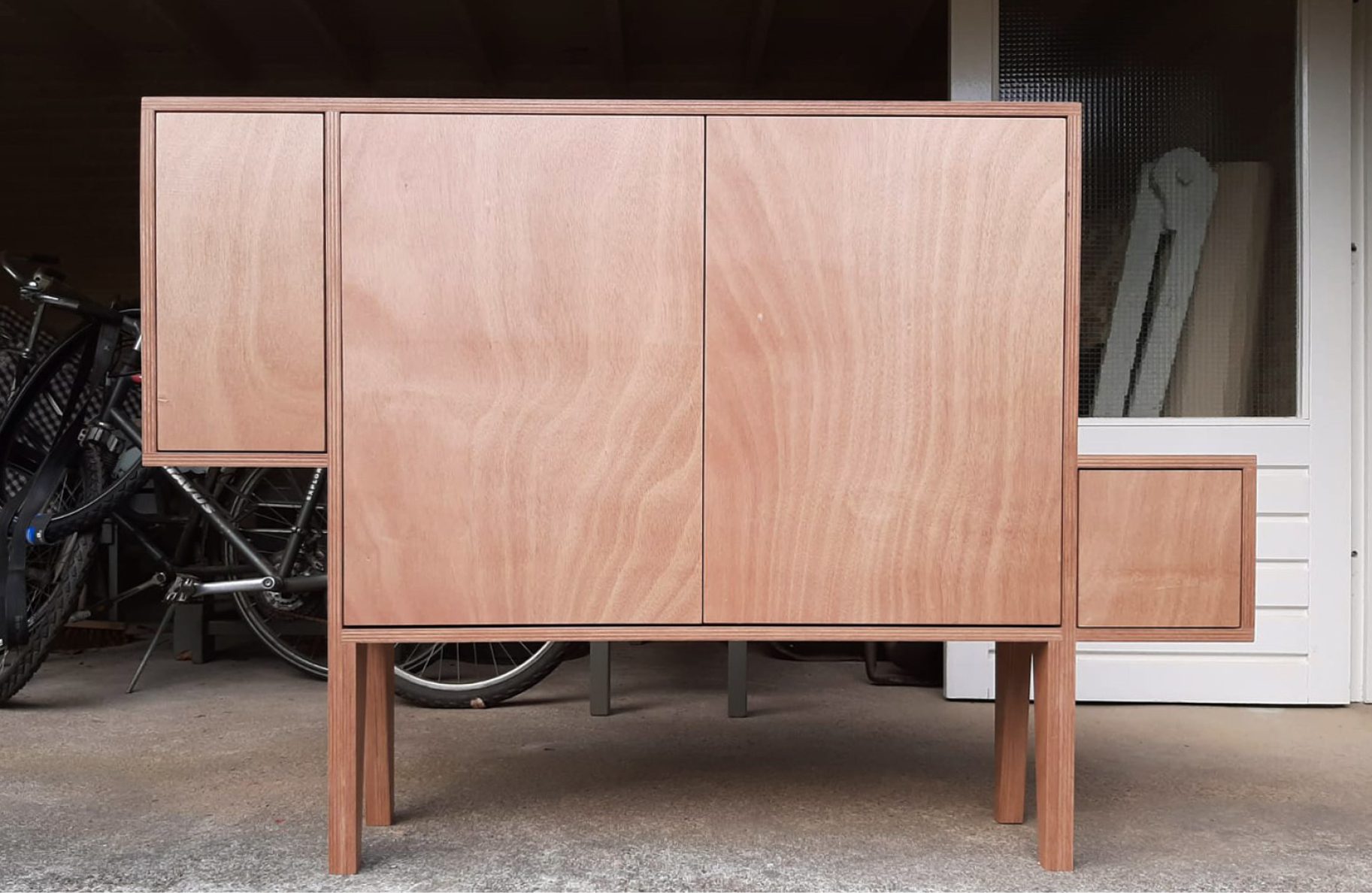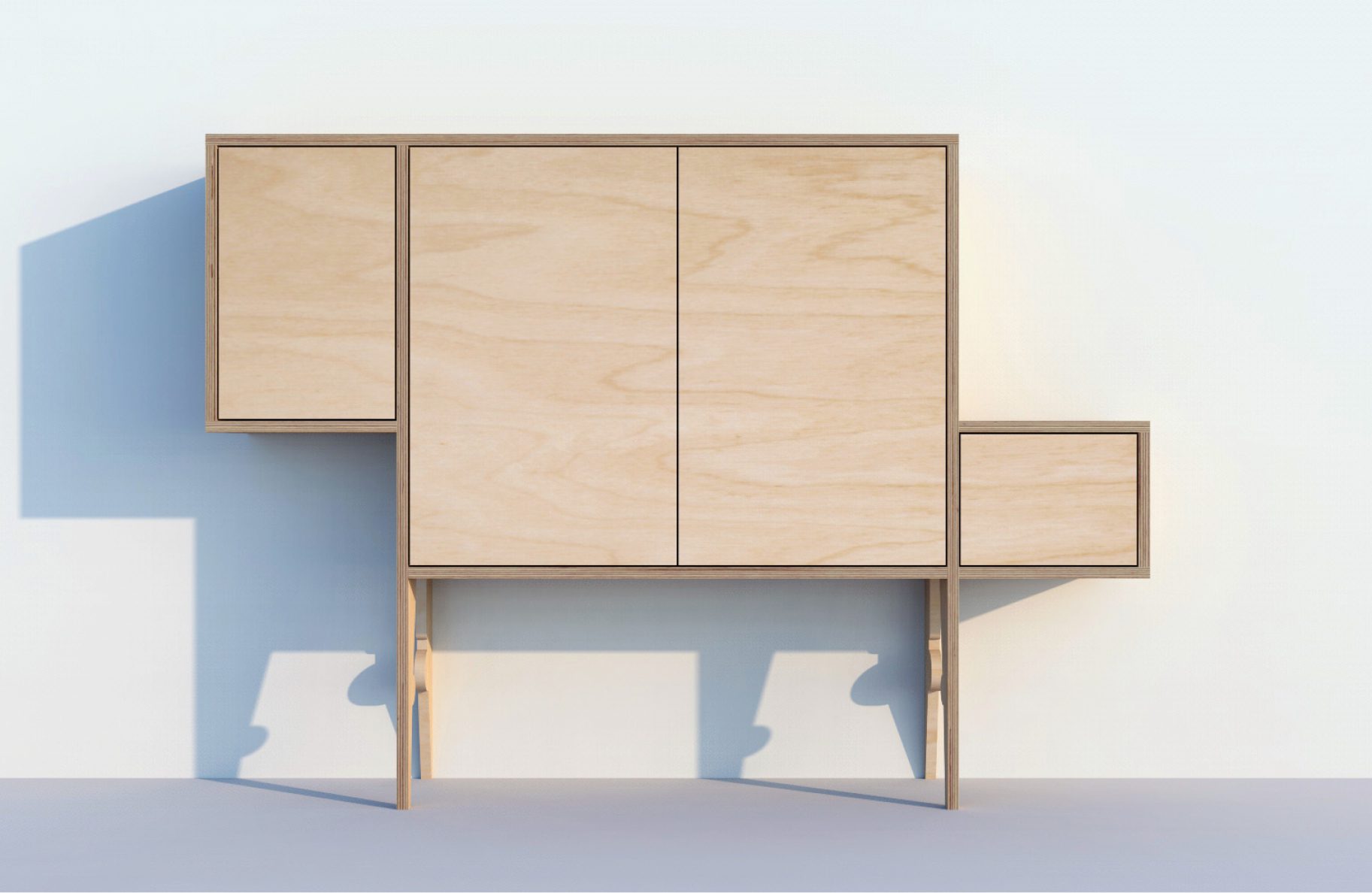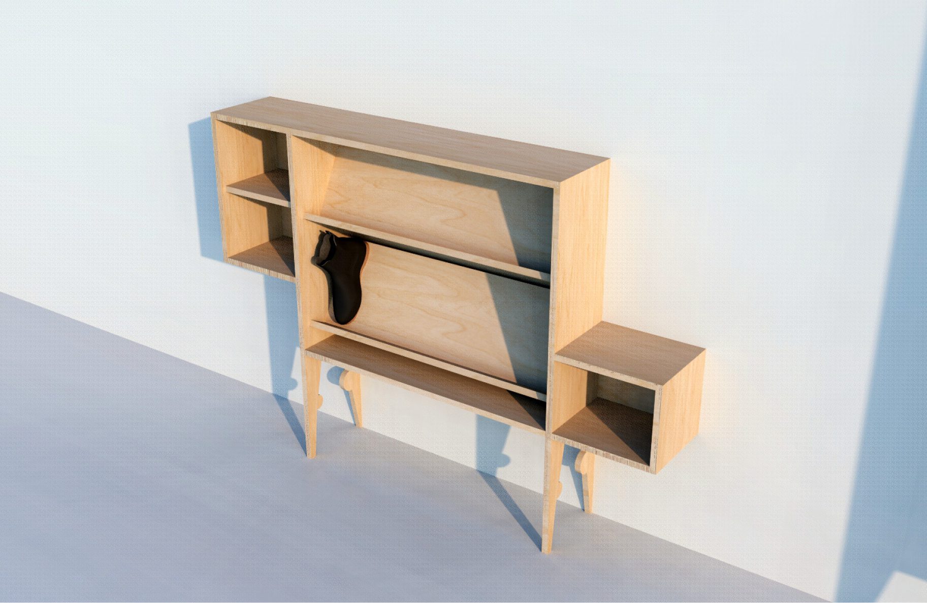 Vandaar de wat aparte vorm. Het berggedeelte van de schoenenkast is opgesplitst in twee kleinere, asymmetrische kastjes, die links en rechts aan het schoenengedeelte hangen.