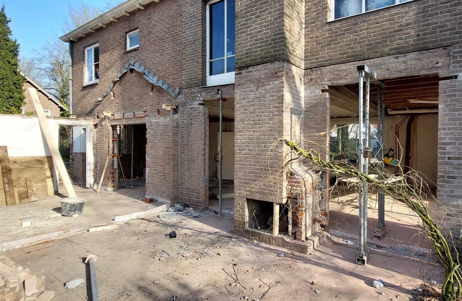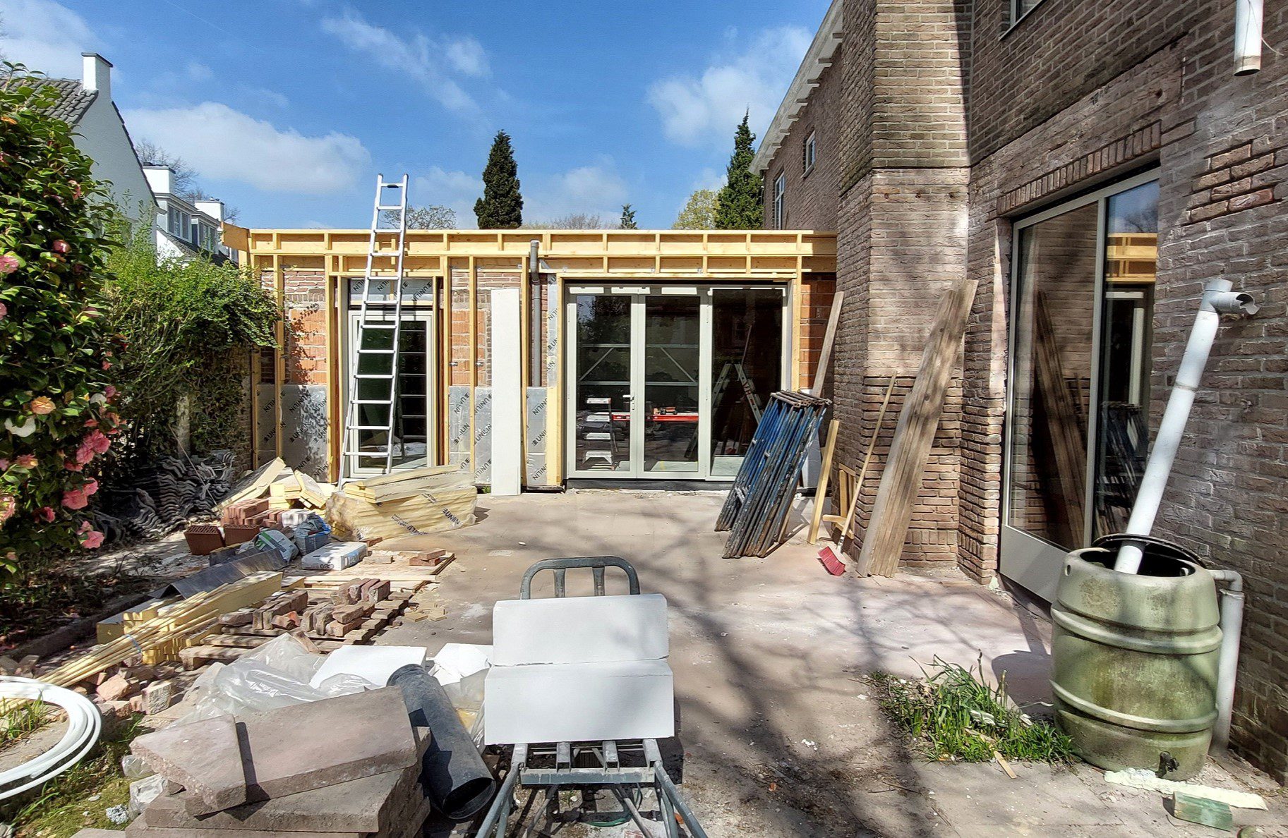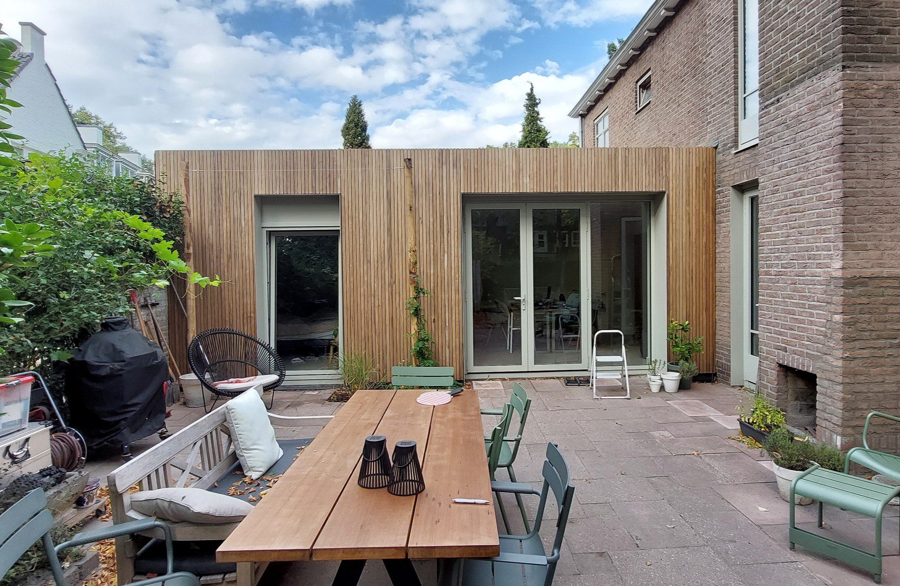 De prefab berging, de carport en de serre worden gesloopt. De kappen van de bestaande aanbouw, die in de loop van de jaren zijn toegevoegd, worden gesloopt en vervangen door een plat dak. De aanbouw krijgt een nieuwe gevelbekleding van houten latten. Binnen worden de dragende wanden tussen de woonkamer, de kleine keuken en de bijkeuken gesloopt om een open woon- eetkamer te maken. In de zij- en achtergevel komen grote ramen om meer licht in de woonkamer te krijgen.