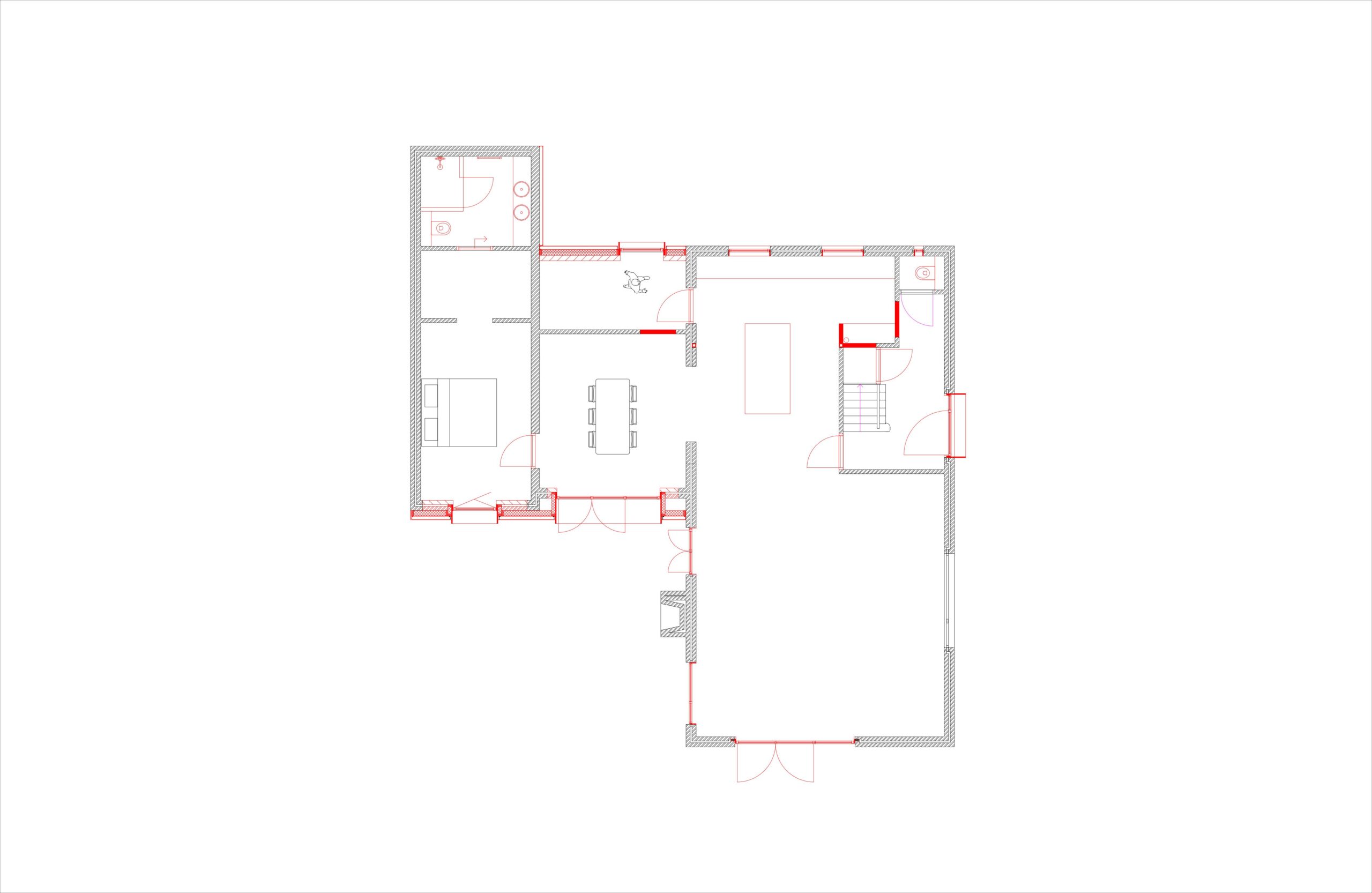 De ‘ontrommeling’ is de eerste opgave: de aanpassingen die aan de woning gedaan gaan worden, bieden de mogelijkheid om een rustiger beeld te maken. Daarnaast is de woning ook aan een grondige bouwkundige renovatie toe. Zo goed als het kan na isoleren, een nieuwe installatie met zonnepanelen en een warmtepomp, een nieuwe geïsoleerde betonvloer met vloerverwarming op de begane grond en nieuwe kozijnen met goed geïsoleerde ramen. Maar ook de indeling, vooral van de begane grond, wringt een beetje. De bestaande keuken is heel klein en volledig gescheiden van de woonkamer.