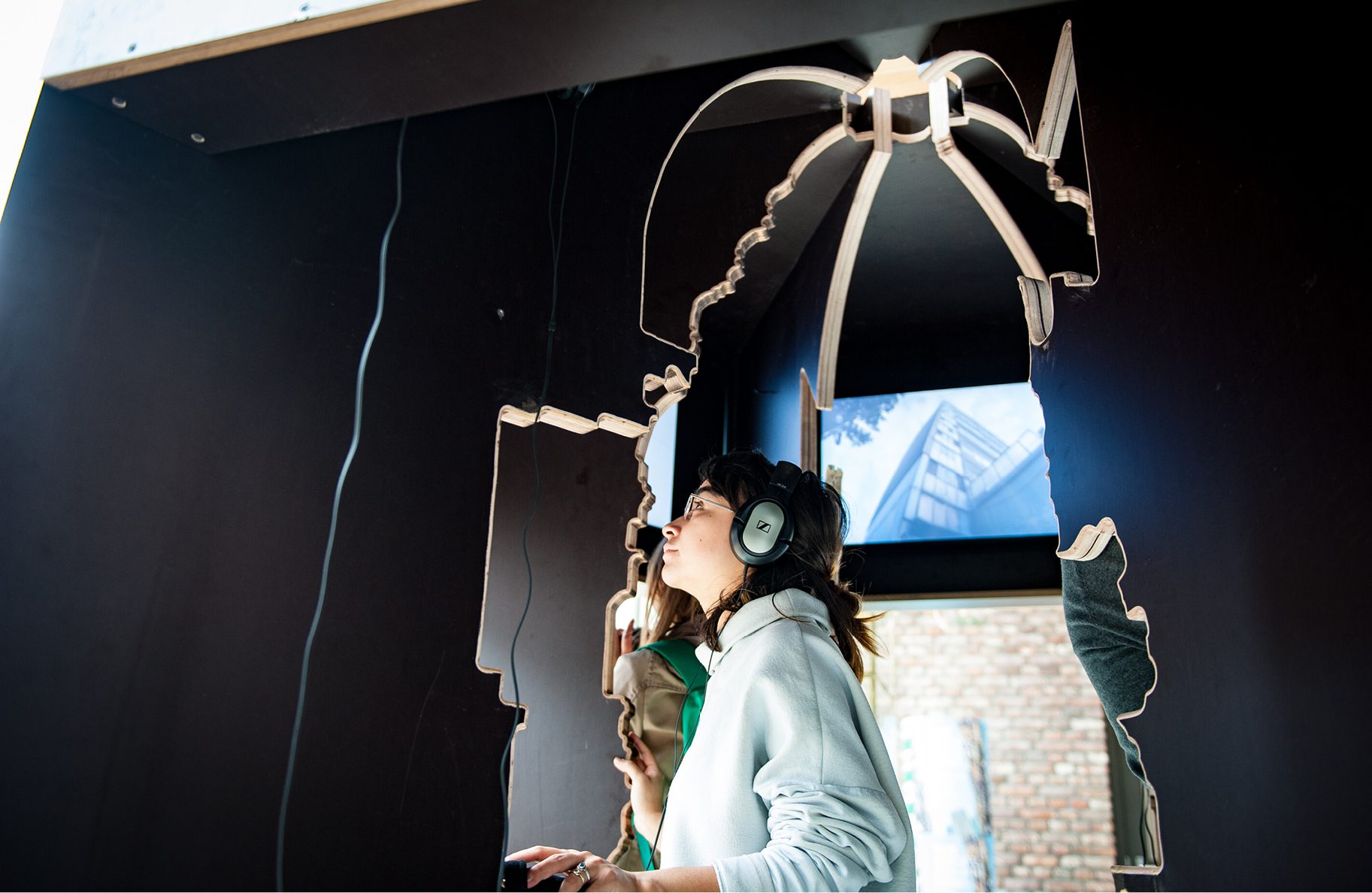 Ontwerp een video paviljoen waarin de zes experimentele films aan bezoekers getoond kunnen worden.